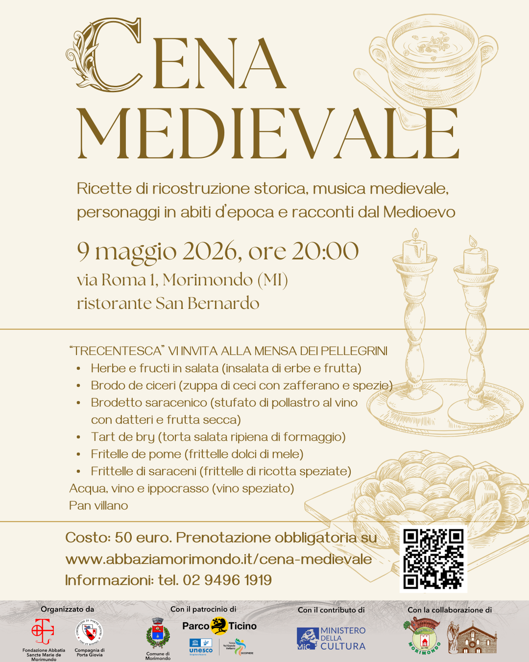 Sabato 9 maggio 2026- Abbazia di Morimondo (MI), in occasione dell’edizione 2026 di “Trecentesca – Giornate di ricostruzione storica”, siete invitati a una serata alla scoperta della cucina medievale e dell’alimentazione di monaci, pellegrini e nobili nel Trecento. La serata prenderà vita tra musiche medioevali, voci di personaggi in abiti d’epoca e racconti di un tempo lontano che, per una notte, tornerà a essere straordinariamente vicino!